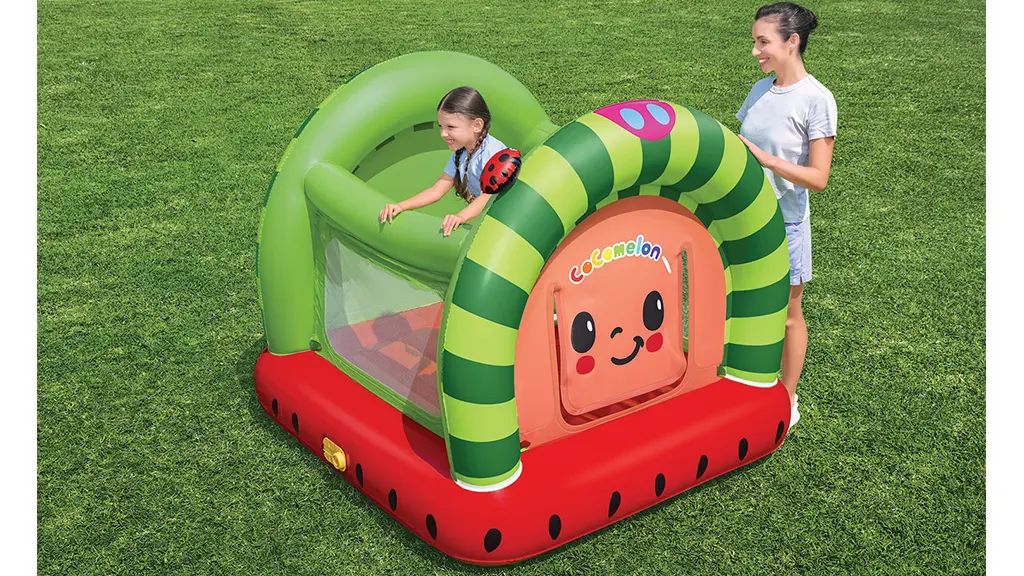 Acest trambulin inspirat de CoComelon are grafică, pereți laterali plasați și o pompă încorporată. Stimulează dezvoltarea abilităților motorii, coordonarea mână-ochi, jocul fizic și agilitatea.