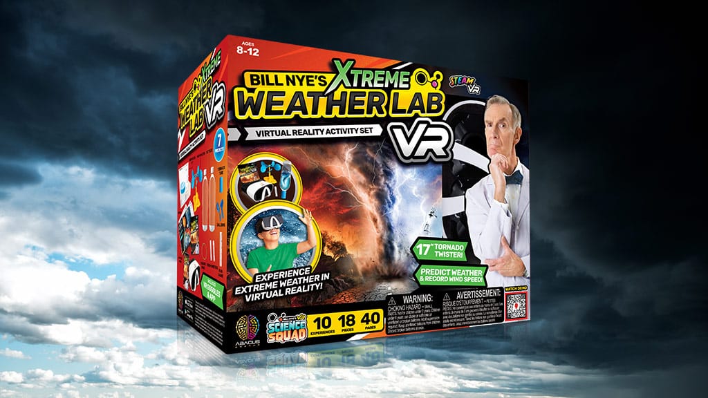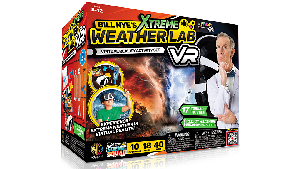 Laboratorul VR Bill Nye Extreme Weather, conceput pentru copii, este o modalitate distractivă de a învăța despre dezastrele naturale și funcționarea acestora. Aventura de învățare este compusă din trei părți: cunoașterea dezastrelor naturale cu ajutorul ghidului inclus, efectuarea de experimente cu ajutorul instrumentelor și tabelelor incluse, și experimentarea dezastrelor naturale în realitatea virtuală (VR)! Pentru a accesa elementele VR ale setului, copiii trebuie să descarce aplicația Bill Nye VR Science Squad pe un telefon sau un dispozitiv similar. Apoi, cu ajutorul codului de activare din ghid, copiii pot debloca segmentul Xtreme Weather VR. Copiii pot fie să introducă telefonul în setul VR inclus pentru a experimenta furtuni, avalanșe și alte dezastre în realitatea virtuală, fie să împărtășească experiența cu prietenii lor în modul ecran complet.