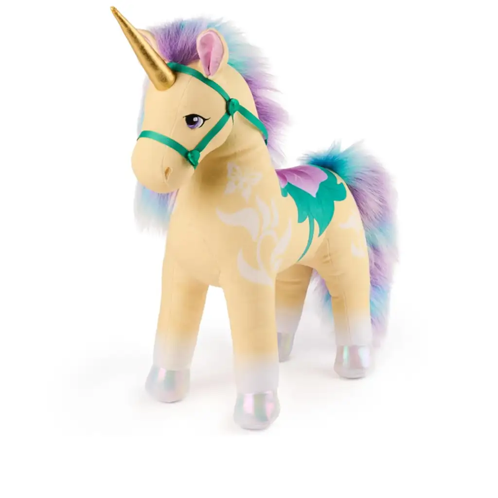 Leaf, unul dintre cei mai deosebiți locuitori ai fabuloasei Academii de Unicorni, te invită la aventuri magice! Această unicorn de pluș moale, de 38 cm înălțime, nu numai că stimulează imaginația copiilor, ci ajunge rapid aproape de inimile lor. Unicornul adorabil, cu corn auriu și culori vesele – corp galben pastel, copite strălucitoare, coamă și coadă albastru-lila – creează o adevărată atmosferă de poveste în camera copilului.