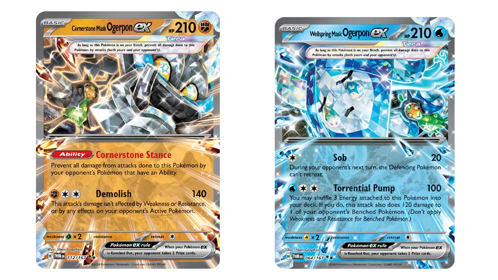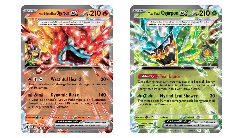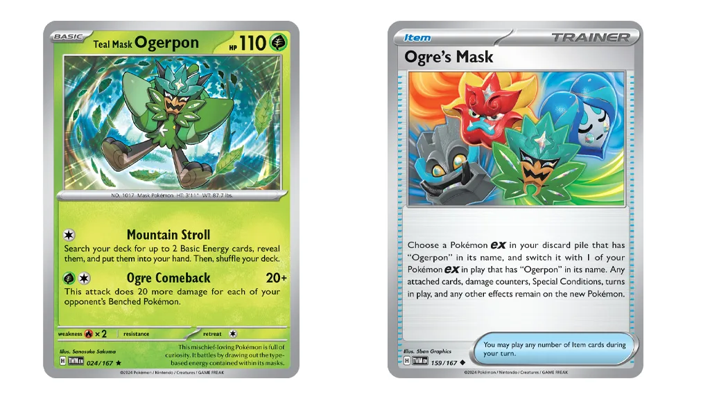 Debutul lui Ogerpon în Pokémon TCG este un eveniment mare, iar Pokémon Co. International sărbătorește corespunzător: Șase noi cărți din extensia Scarlet & Violet — Twilight Masquerade au fost dezvăluite. Jucătorii abia așteaptă să adauge cărțile Teal Mask Ogerpon ex, Hearthflame Mask Ogerpon ex, Wellspring Mask Ogerpon ex, Cornerstone Mask Ogerpon ex, Teal Mask Ogerpon și Ogre’s Mask în bătăliile lor.