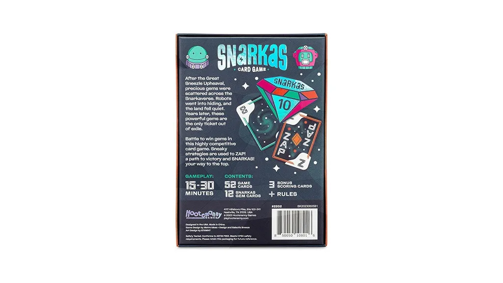 Acest joc nu este doar extrem de amuzant de jucat, dar povestea creativă de fundal oferă detalii distractive pentru a captiva copiii. După "Marea Strănutare de Haos", pietrele prețioase s-au împrăștiat în Snarkaverse și roboții s-au ascuns. Ani mai târziu, aceste pietre prețioase sunt singura cale de evadare din exil. Încurajează imaginația să zboare liber!Snarkas 8 ani este destinat copiilor mai mari și introduce multe metode distractive de învățare, cu elemente de adunare și strategice.Cu toate acestea, acest joc este distractiv și pentru grupuri de adulți. Dacă îl scoți la o petrecere de vizionare a Superbowl-ului înainte de începerea meciului, s-ar putea să te trezești că ai ratat accidental meciul de fotbal. În plus, vine într-o cutie destul de mică, așa că poate fi ușor împachetat și luat cu tine la orice ocazie, ca un joc de călătorie.