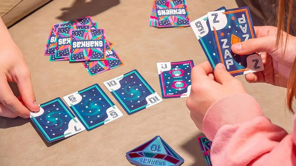 Snarkas oferă o poveste unică pentru educație și un gameplay captivant.Instrucțiunile jocului sunt ușor de urmat!Adună încă 1-3 jucători în afară de tine pentru a începe jocul. Numărul de cărți distribuite depinde de câți se alătură ție, și dacă sunteți în total patru, atunci veți juca în două echipe.Fiecare jucător merge în cerc și pune o carte pe masă din mâna sa. Poți colecta cărți dacă cartea jucată din mâna ta se potrivește cu oricare de pe masă, sau poți colecta o combinație de cărți a căror sumă corespunde numărului cărții tale jucate. După ce toată lumea și-a jucat cărțile, dealerul împarte noi mâini. Runda continuă până când în pachet nu mai sunt cărți, iar rezultatul final depinde de câte **pietre prețioase** ai pe cărțile din colecția ta.Există cărți speciale în pachet care chiar condimentează jocul și cresc tensiunea. Cărțile ZAP permit unui jucător să colecteze toate cărțile de pe masă. Dacă, totuși, reușești să colectezi toate cărțile de pe masă fără o carte ZAP, atunci câștigi o Perlă Snarkas, care valorează un total de 10 perle. Există, de asemenea, cărți Aster și Jolt - adică mascotele robot amuzante ale jocului - și dacă colectezi toate cele patru, primești patru perle.