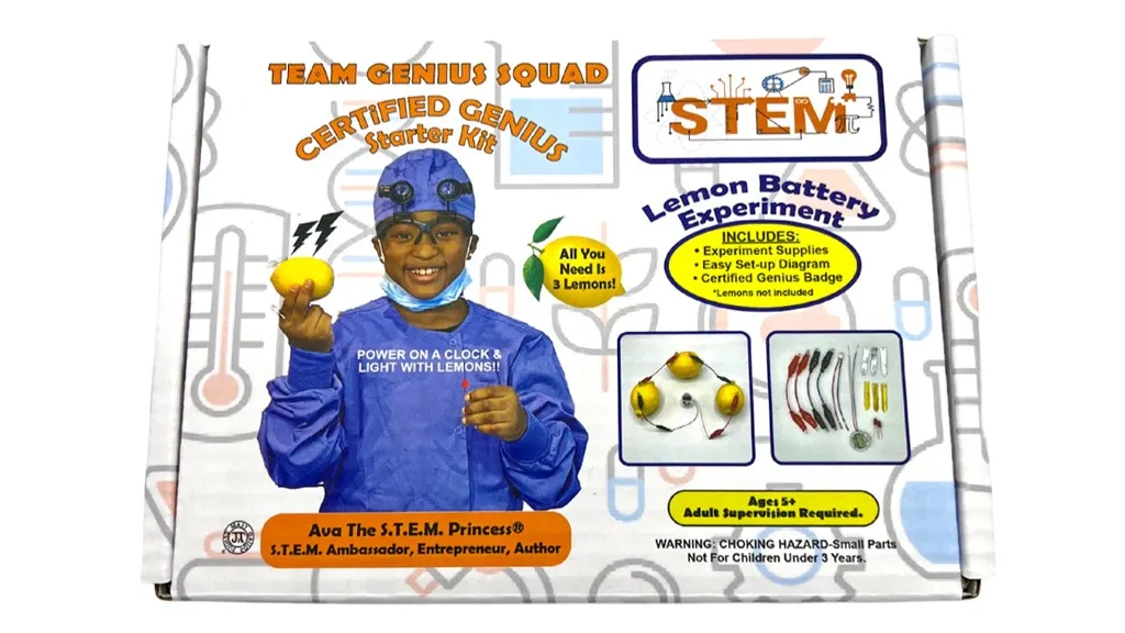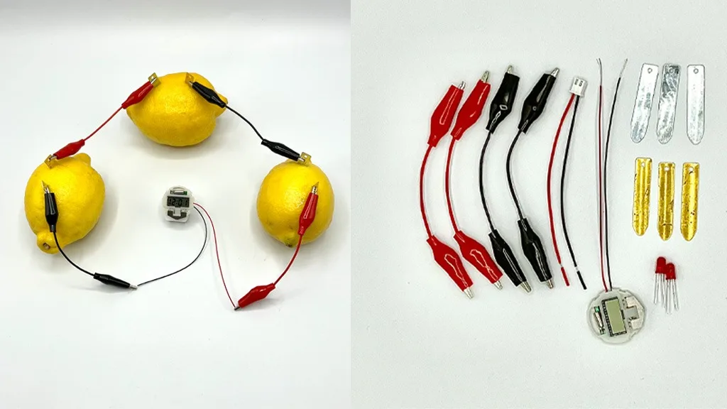 Kitul experimental STEM Electricitatea Lămâii include patru clești de crocodil, trei bucăți de cupru, trei bucăți de zinc, un fir cu soclu pentru bec, două becuri și un ceas. Tinerii oameni de știință pot descoperi cum să genereze electricitate din lămâi cu ajutorul acestui kit.