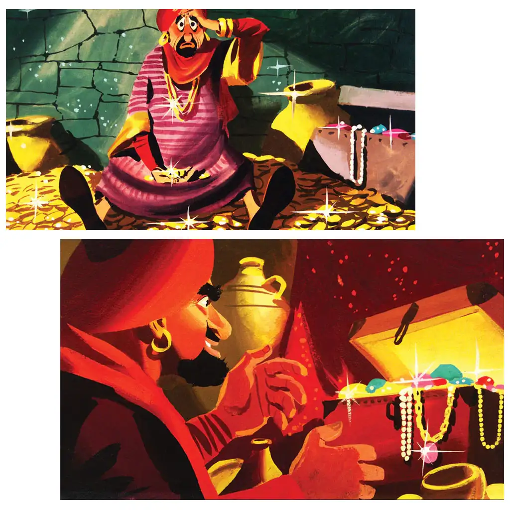 Pe parcursul poveștii, Ali Baba folosește cu iscusință și viclenie descoperirea și împarte comorile. Un detaliu interesant este de ce Ali Baba o dă de soție pe servitoare fiului său. Desenele au fost realizate de Lengyel Sándor, contribuind la atractivitatea vizuală a poveștii.