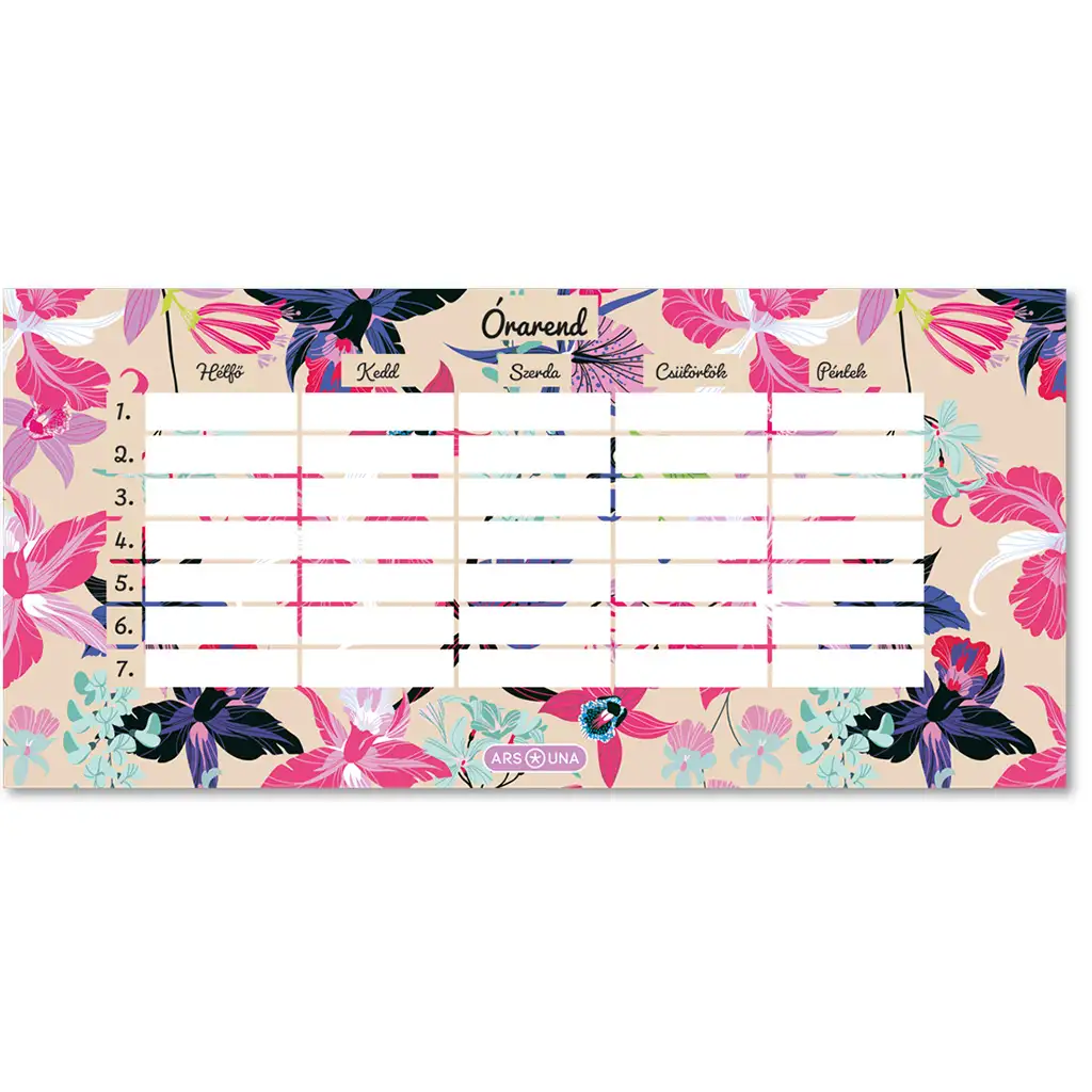 Program școlar înflorit pentru fiecare săptămână de școală! Orarul Beach Flowers de la Ars Una este o piesă cu adevărat stilată, care nu doar că este practică, ci și încântătoare privirii. Designul floral decorează împărțirea de luni până vineri cu nuanțe pastel elegante și o paletă bogată de culori, fiind astfel alegerea ideală pentru cei care iubesc accesoriile la modă și colorate pentru învățare.
