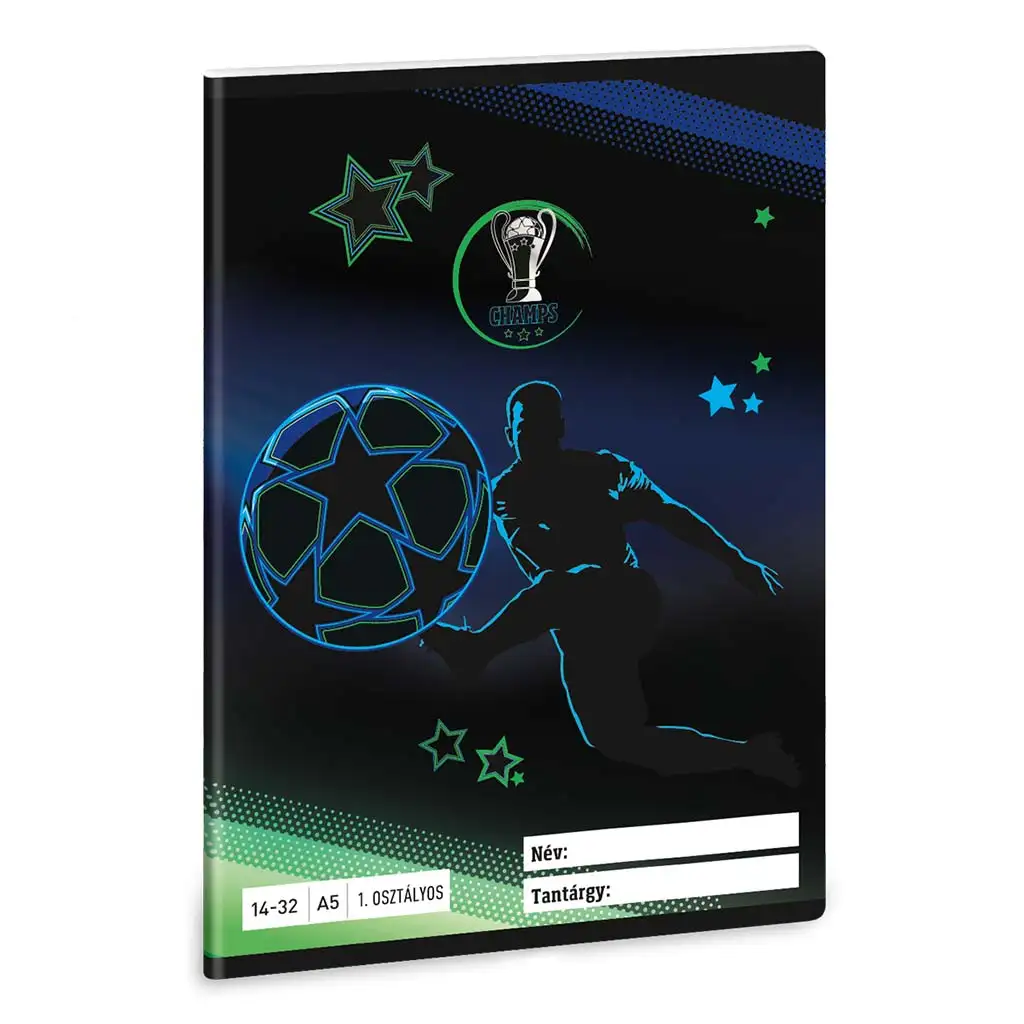 Acest caiet modern este o alegere excelentă pentru orice mic fan al fotbalului care abia începe să descopere lumea scrisului. Pe copertă se află un fotbalist plin de energie și o minge uriașă, decorate cu stele și un trofeu. Fundalul în nuanțe de negru, albastru și verde emană o atmosferă modernă, sportivă, care îl va încuraja pe copilul tău să se apuce cu entuziasm de temele școlare. Designul va câștiga cu siguranță simpatia tuturor elevilor care iubesc fotbalul.