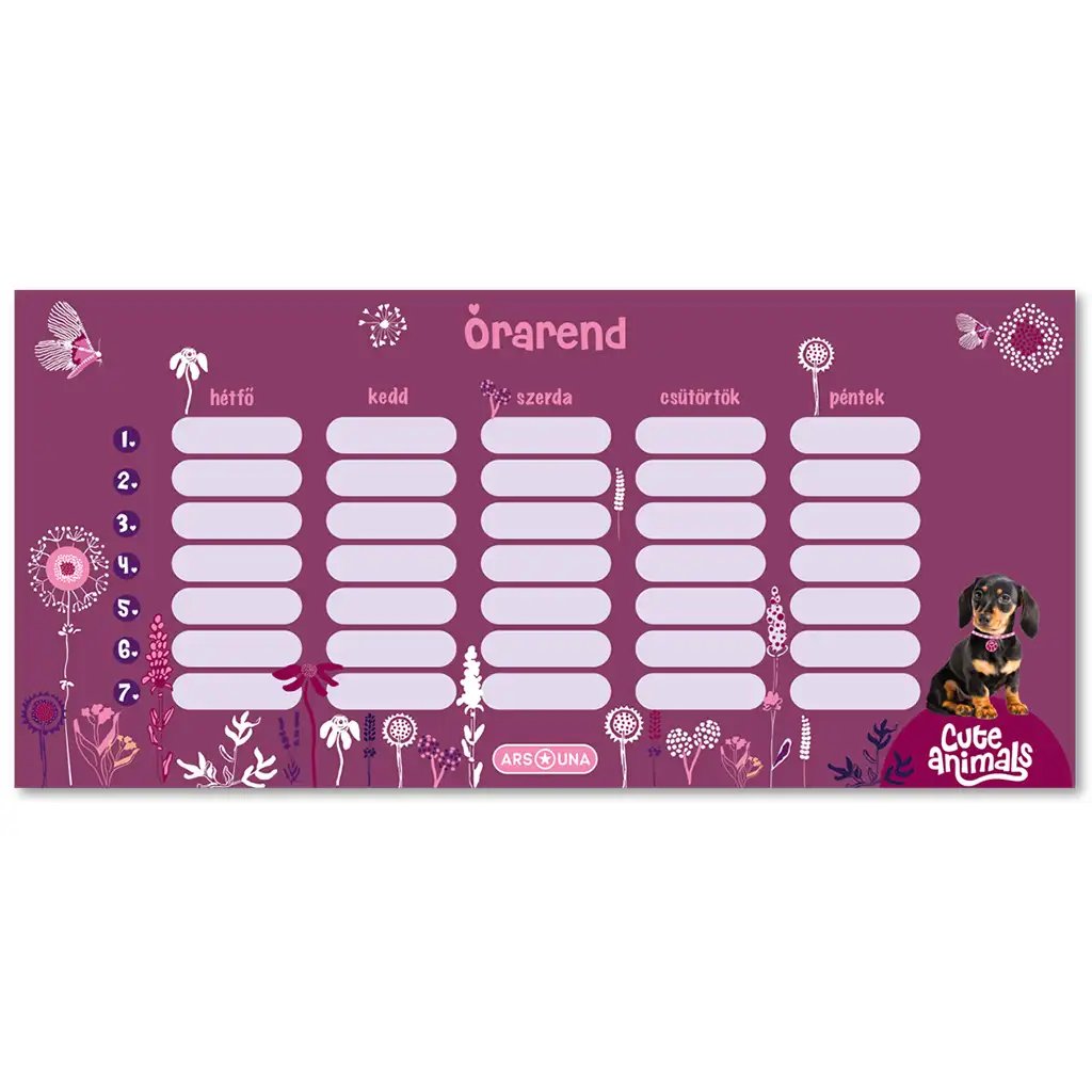 Dimensiunile orarului (232 x 109 mm) sunt practice și ușor de manevrat, ideale atât pentru a fi pus în ghiozdanul de școală, cât și pe birou. Fie că este vorba de învățare sau organizare, orarul cu cățeluși teckel Ars Una Cute Animals - Puppy te ajută să îți menții programul zilnic clar și organizat. Alege acest orar drăguț și feminin pentru a-ți gestiona sarcinile zilnice cu stil și pentru a te înconjura de cățeluși teckel adorabili!
