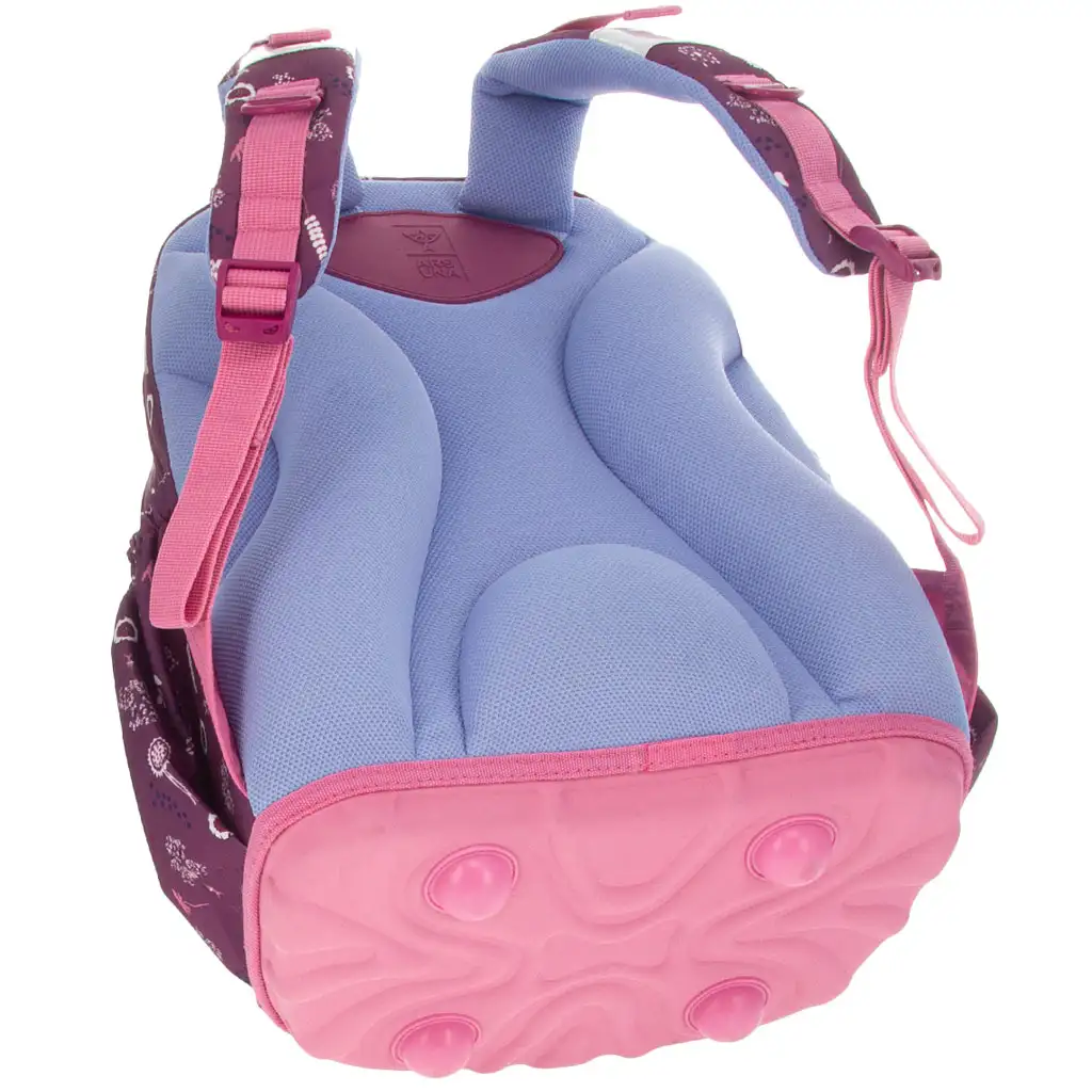 Spatele ghiozdanului se potrivește perfect cu spatele copilului, reducând presiunea asupra coloanei vertebrale. Datorită distribuției proporționale a greutății pe umeri și mușchii spatelui, ghiozdanul este confortabil de purtat chiar și pe perioade mai lungi.