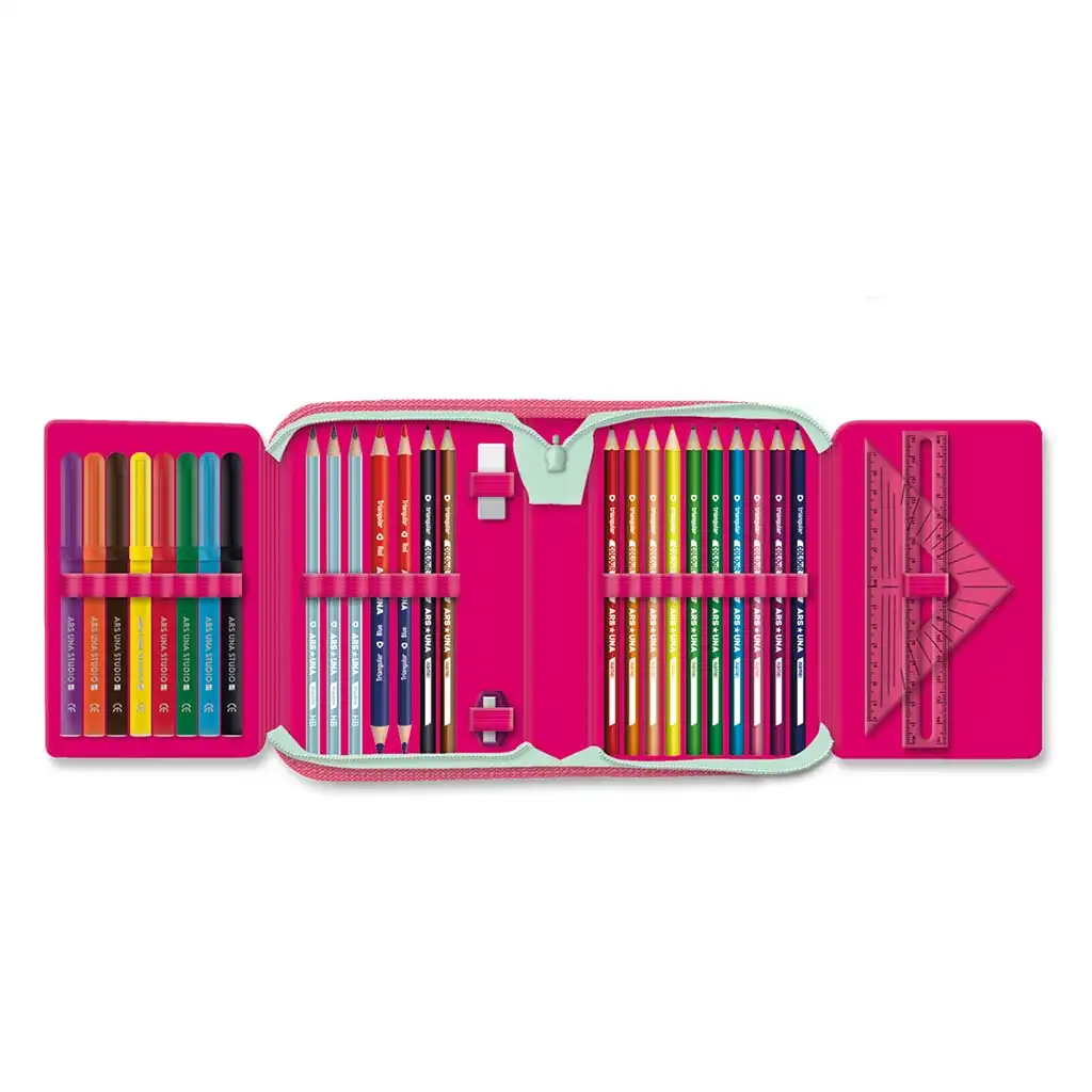 Designul cu fermoar asigură acces rapid și ușor, iar conținutul oferă un set complet: creioane colorate, carioci, creioane grafit, radieră, ascuțitoare și rigle – toate sunt frumos aranjate pentru ca micuțul tău să găsească ușor ceea ce are nevoie.