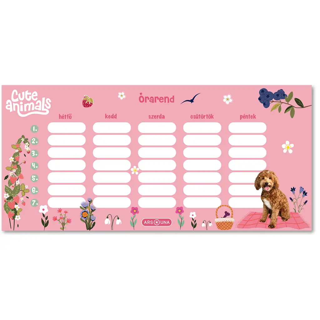 Începutul anului școlar va fi și mai vesel cu acest orar simpatic cu cățeluși, creat special pentru copiii care iubesc animalele. Orarul Cute Animals – Doggie, tipărit pe o singură coală, față-verso, cu fundal roz, modele florale și imaginea unui cățeluș drăguț și zâmbitor, este nu doar practic, ci și un adevărat element de decor pentru camera copilului sau pentru mapa de școală.