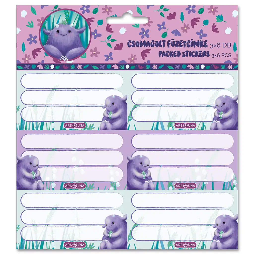 Designul este cu adevărat fermecător, vesel, emanând o atmosferă apropiată de natură. Pe etichete se vede o creatură drăguță, de culoare mov, pufoasă, care ronțăie o plantă, iar în jurul ei iarba și florile sălbatice completează compoziția. Paleta de culori este discretă, dar totuși jucăușă, astfel încât să fie pe placul copiilor din clasele primare, în special celor care iubesc ilustrațiile drăguțe și de poveste. Fundalul etichetelor este deschis, astfel încât numele și materia scrise pe ele rămân ușor de citit, ajutând la evitarea încurcăturilor de caiete la școală.