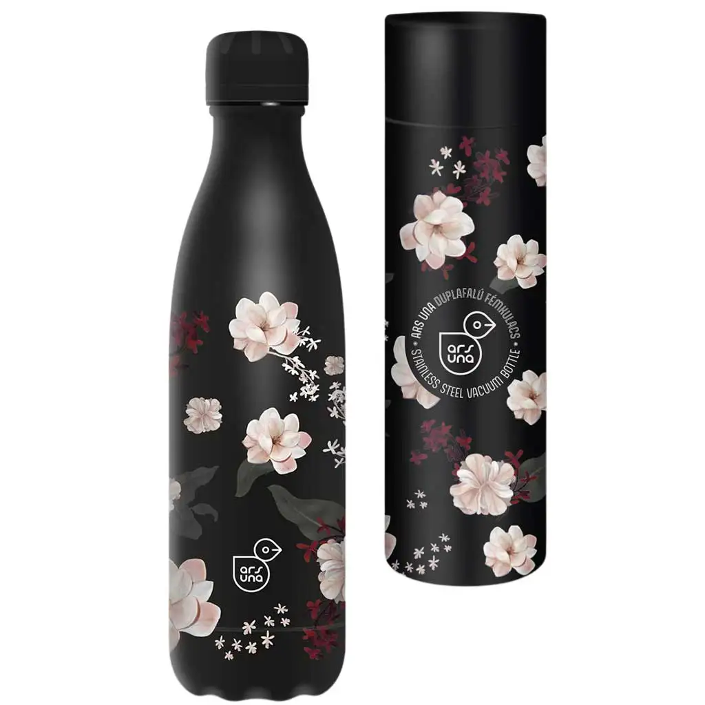 Sticla metalică cu pereți dubli Ars Una Flowery Black nu este doar frumoasă, ci și extrem de practică, fiind un partener de încredere în viața de zi cu zi! Această sticlă de 500 ml este decorată cu modele florale delicate pe un fundal elegant negru, ceea ce îi conferă un aspect unic și stilat. Materialul sticlei este de calitate superioară, realizat din oțel inoxidabil 304SS conform standardelor UE, astfel încât te poți baza pe ea pe termen lung, fie că este vorba de păstrarea băuturilor calde sau reci.