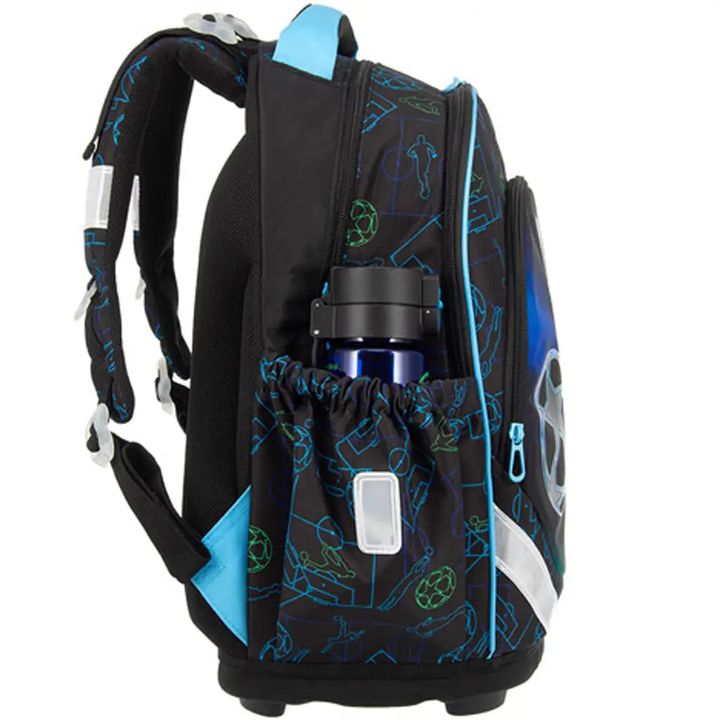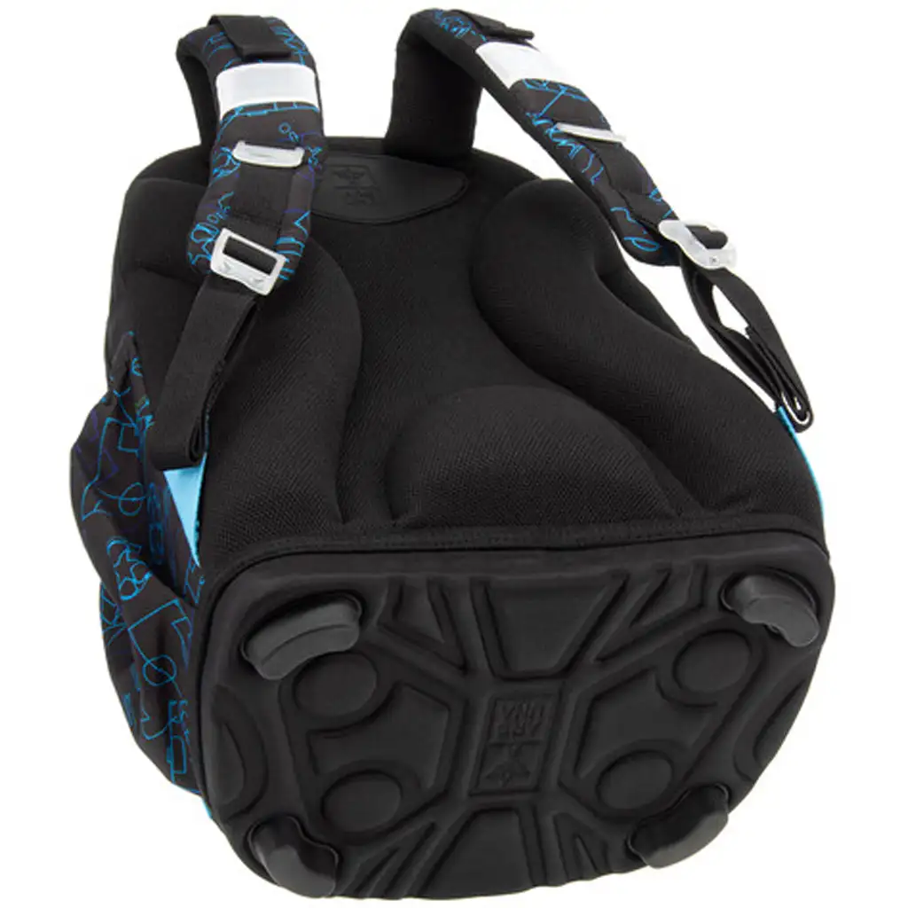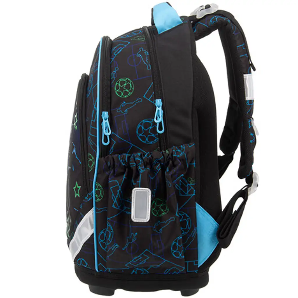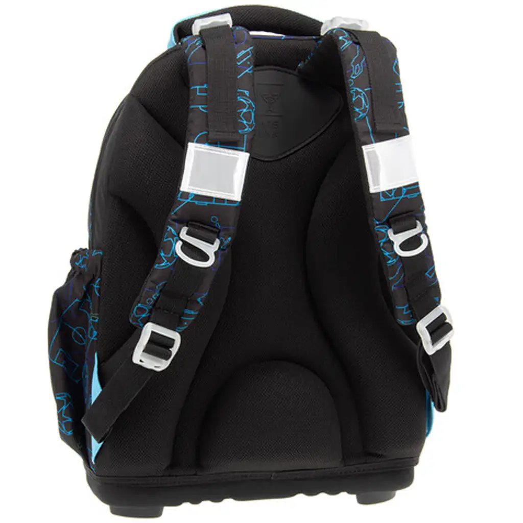 Partea de jos a ghiozdanului, realizată din material rezistent și tare, este completată de patru picioare stabile din plastic – astfel, ghiozdanul nu doar că este durabil, ci stă bine și pe podea. Interiorul dispune de trei compartimente cu fermoar: cel mai mare are un separator textil pentru o mai bună organizare, iar cel mai mic are suport cusut pentru instrumente de scris și un buzunar pentru acte. Două buzunare laterale cu elastic oferă spațiu pentru sticlă sau alte obiecte mici. Nici siguranța nu a fost neglijată: ghiozdanul are mai multe elemente reflectorizante de dimensiuni mari, pentru ca copilul tău să fie vizibil în trafic.