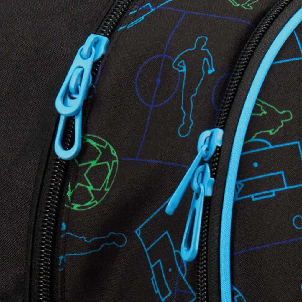 - 3 compartimente cu fermoar, suport pentru instrumente de scris, buzunare laterale și elemente reflectorizante pentru siguranță