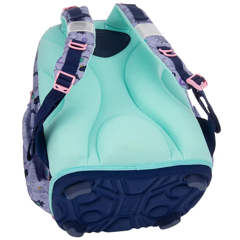 Spatele ergonomic, prietenos cu coloana vertebrală, secțiunea lombară căptușită și bretelele moi, reglabile în mai multe puncte, asigură o postură sănătoasă a copilului chiar și pe parcursul unei zile întregi. Are o greutate foarte redusă – doar 0,9 kg – ceea ce îl face ușor de purtat chiar și pentru cei mici. Materialul rezistent și durabil face față provocărilor zilnice, iar cele patru piciorușe din plastic de la bază oferă stabilitate suplimentară și protejează partea de jos a ghiozdanului împotriva uzurii.
