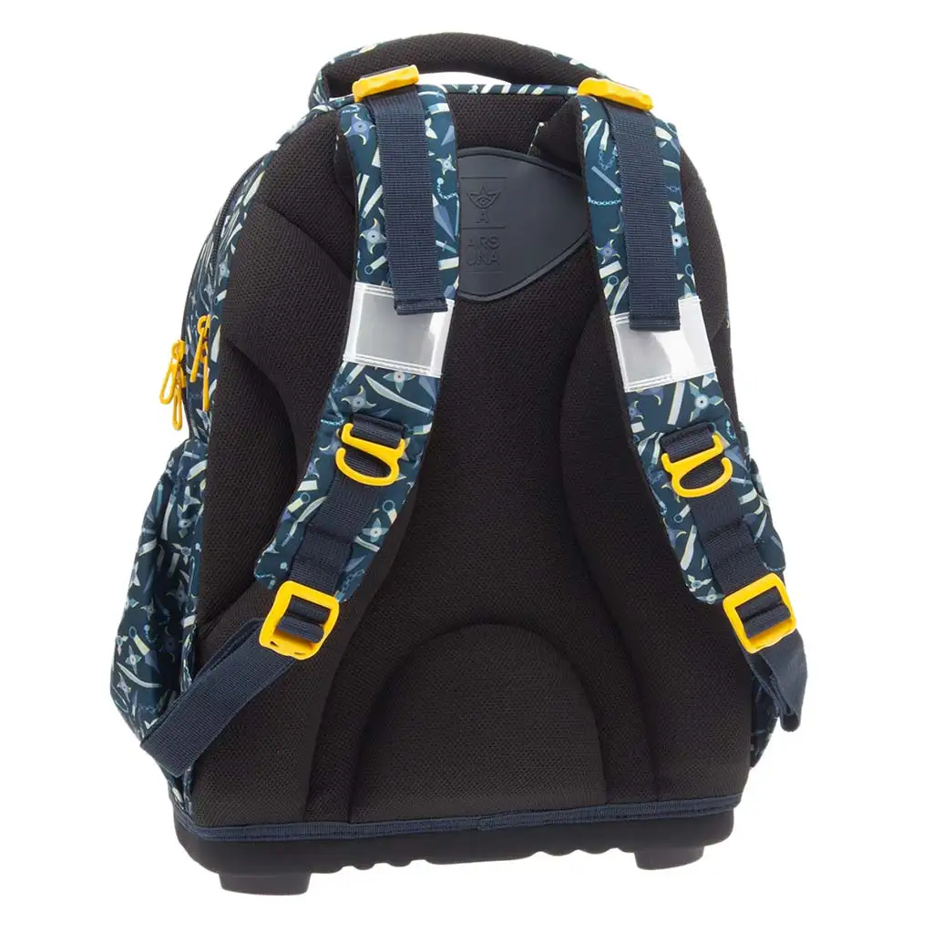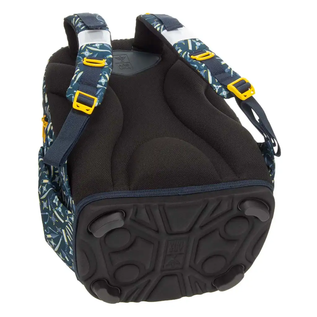Greutatea rucsacului este de doar 0,9 kg, ceea ce îl face ușor de purtat și ideal pentru copii. Cele trei compartimente spațioase cu fermoar ajută la organizare: cel mai mare compartiment are un separator textil, iar cel mai mic dispune de suport pentru instrumente de scris și buzunar pentru legitimație cusut. Pe ambele laterale există buzunare elastice unde se poate ține o sticlă de apă sau alte obiecte mici. Partea de jos este realizată din material rezistent, iar cele 4 piciorușe din plastic protejează ghiozdanul împotriva uzurii, iar elementele reflectorizante sporesc siguranța pe timp de noapte.