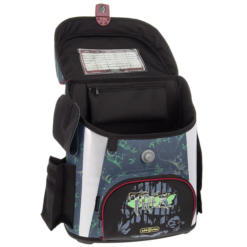 Rucsacul Școlar cu Închidere Magnetică T-Rex este pregătit pentru orice: materialul său respinge apa, partea de jos din plastic dur și numeroasele compartimente interioare practice asigură că copilul tău poate lua cu el toate lucrurile importante la școală. Nu ezita, alege calitatea și stilul!