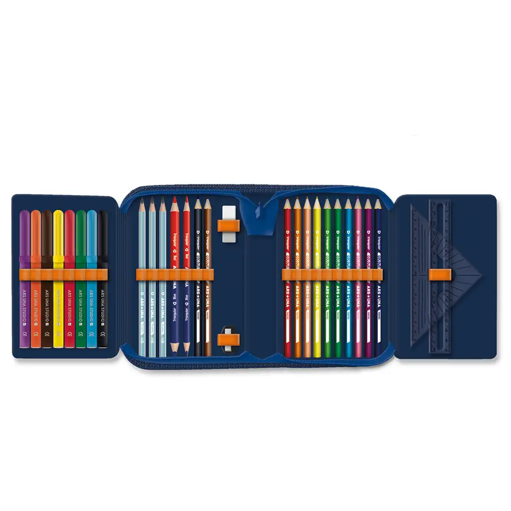 Penarul conține numeroase instrumente diferite, astfel încât fiecare elev să găsească ceea ce i se potrivește cel mai bine. 12 creioane colorate triunghiulare asigură o prindere ușoară și o scriere confortabilă. În plus, sunt disponibile trei creioane grafit HB, precum și un marker subțire și unul gros, pentru a face notițele întotdeauna ușoare și precise.