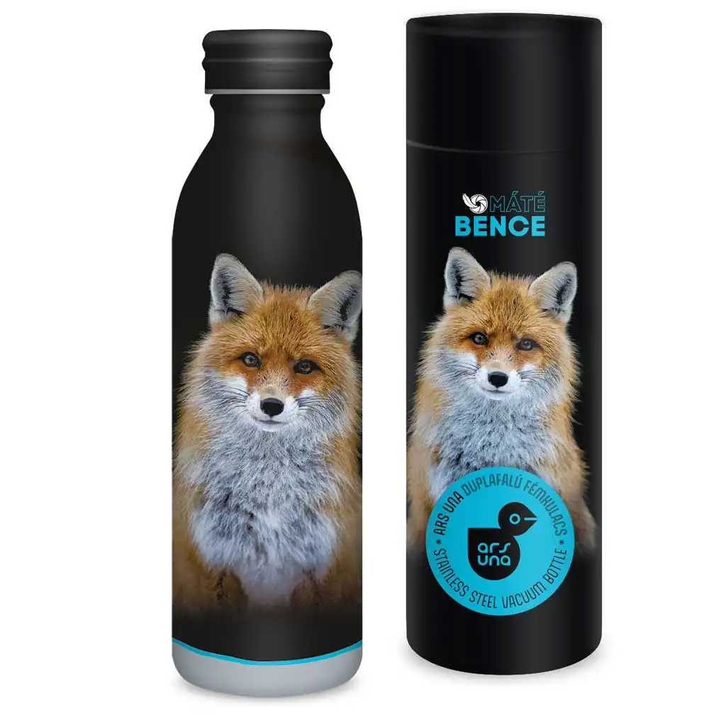 Sticla metalică cu pereți dubli Ars Una Máté Bence - Vulpe nu este doar practică, ci și o piesă de valoare artistică, care captivează iubitorii naturii. Această sticlă specială este decorată cu o fotografie superbă a unei vulpi realizată de Máté Bence, faimosul fotograf de natură maghiar, care îi conferă un aspect viu și realist. Sticla este cu adevărat unică datorită culorii de bază elegante, negru, și portretului detaliat și impresionant al vulpii, în timp ce cutia neagră de cadou o transformă într-o alegere excelentă pentru orice ocazie.