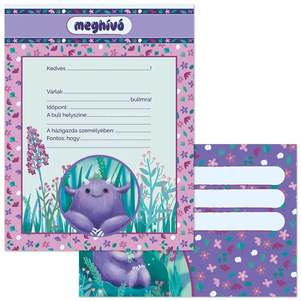 Designul este cu adevărat de poveste și prietenos: micul monstru mov și pufos stă pe o pajiște înflorită și verde, invitând zâmbitor oaspeții la evenimentul special. Rama colorată și florală și nuanțele pastelate fac invitația jucăușă și unică. Plicul se armonizează perfect cu invitația: pe un fundal mov și roz sunt decorate cu modele florale, astfel încât întregul pachet are un aspect unitar și vesel.