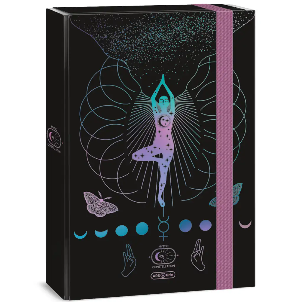 Scufundă-te în lumea stelelor cu această cutie de depozitare pentru caiete Mystic Constellation A/4, care emană liniște, mister și stil în același timp. Ars Una a creat acest design pentru cei atrași de astrologie, spiritualitate sau soluții vizuale unice. Pe copertă se află o figură în postură meditativă, înconjurată de stele, planete, faze ale lunii și simboluri cerești – toate acestea strălucesc în nuanțe de violet și albastru pe un fundal negru.