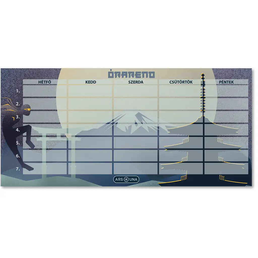 Orarul Ars Una Ninjas in the Dark este creat pentru fanii artelor marțiale japoneze și ai lumii misterioase a acestora, aducând o atmosferă specială în zilele obișnuite de școală. În fundal, o lună plină uriașă se ridică deasupra munților, în timp ce în stânga, un ninja ascuns în umbră observă poarta torii, iar în dreapta, o pagodă impresionantă completează atmosfera orientală.