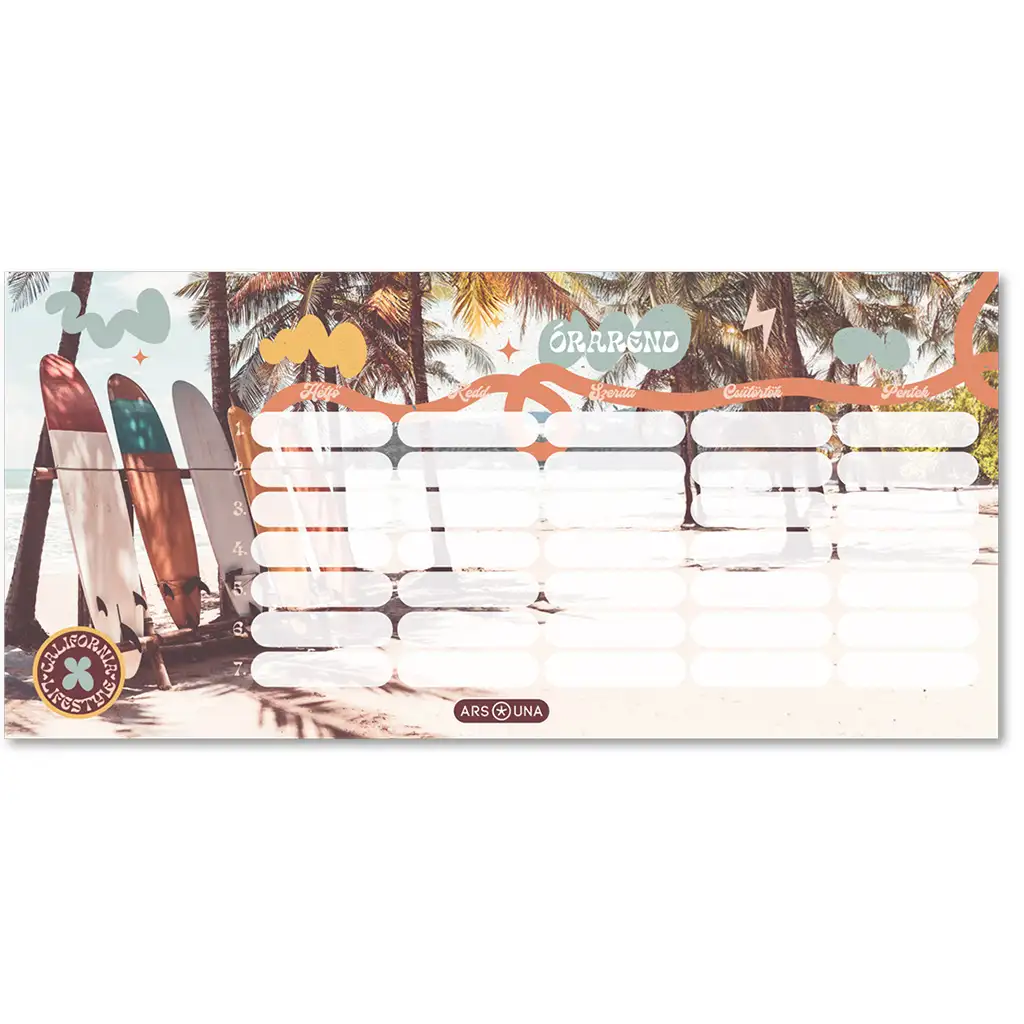 Aduc atmosfera verii în zilele obișnuite de școală cu orarul California Lifestyle, care evocă lumea plajelor însorite, a palmierilor și a plăcilor de surf! Acest orar practic, dintr-o singură coală și față-verso, este alegerea perfectă pentru orice elev care dorește să adauge puțin stil și veselie printre rechizitele școlare. Designul clar face orarul ușor de urmărit, iar grafica specială va aduce zâmbetul pe buze în fiecare zi. Pe o parte predomină atmosfera tropicală, de surferi, iar pe cealaltă parte aceeași temă este prezentată într-o paletă de culori diferită – astfel poți alege oricând ce stare de spirit preferi.