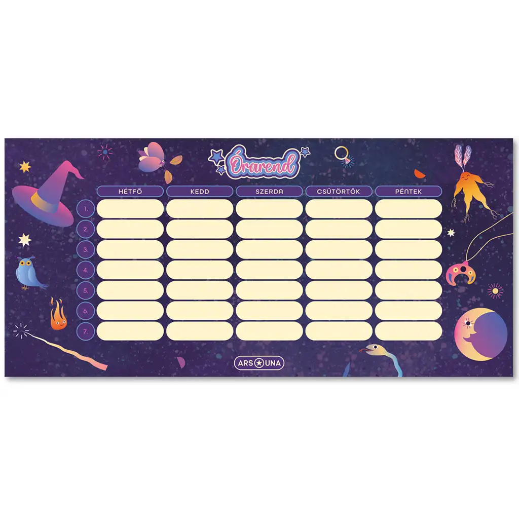 Cunoaște orarul vrăjitoresc Ars Una Enchanted, un accesoriu magic și stilat pentru orice fată care adoră temele magice. Acest orar este decorat cu modele vrăjitorești pe un fundal violet închis, astfel încât nu este doar practic, ci emană și o atmosferă mistică și unică, care te va inspira în fiecare zi.