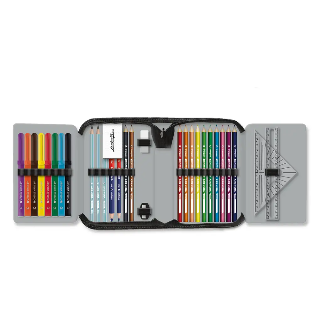 Acest penar încărcat include tot ce ar putea avea nevoie un copil creativ și organizat la școală sau învățând acasă. Conține creioane colorate, creioane grafit, linere, gumă de șters, ascuțitoare și alte rechizite pentru a răspunde cu ușurință la orice provocare și sarcină.