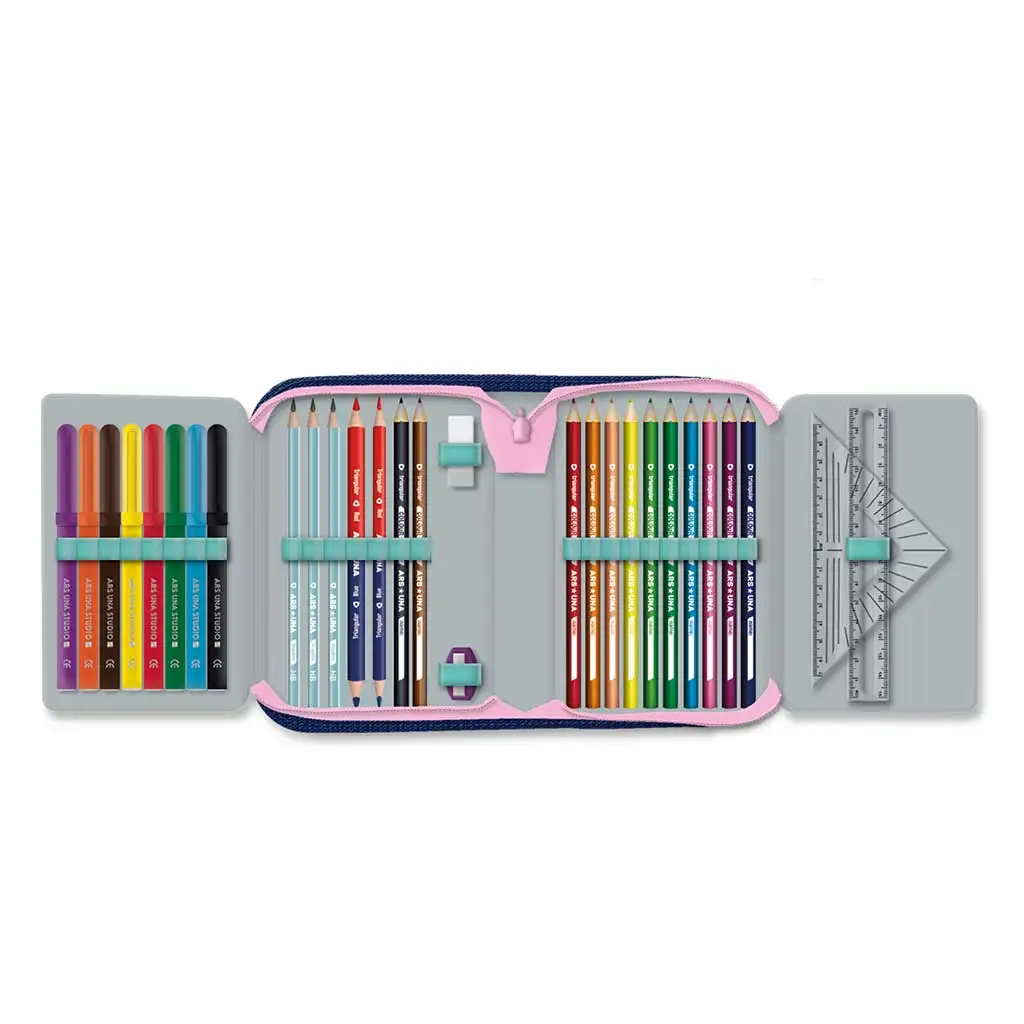 Penarul nu este doar atrăgător, ci și complet echipat. Conține 12 creioane colorate, 8 carioci, 3 creioane grafit, radieră, ascuțitoare, precum și rigle și orar – astfel toate instrumentele importante pentru începutul școlii sunt într-un singur loc. Datorită închiderii cu fermoar, este ușor de utilizat, iar compartimentarea interioară ajută la păstrarea ordinii.