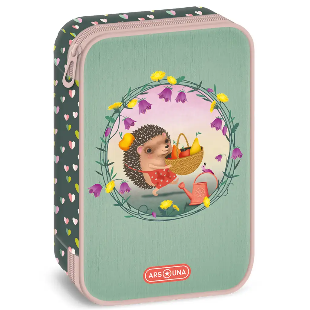 Penarul multietajat Ars Una Apple Pie este alegerea ideală pentru orice fată care iubește modelul adorabil cu arici și dorește să-și organizeze rechizitele de scris. Modelul cu arici pe fundal verde pastel adaugă veselie și un stil unic acestui penar practic.