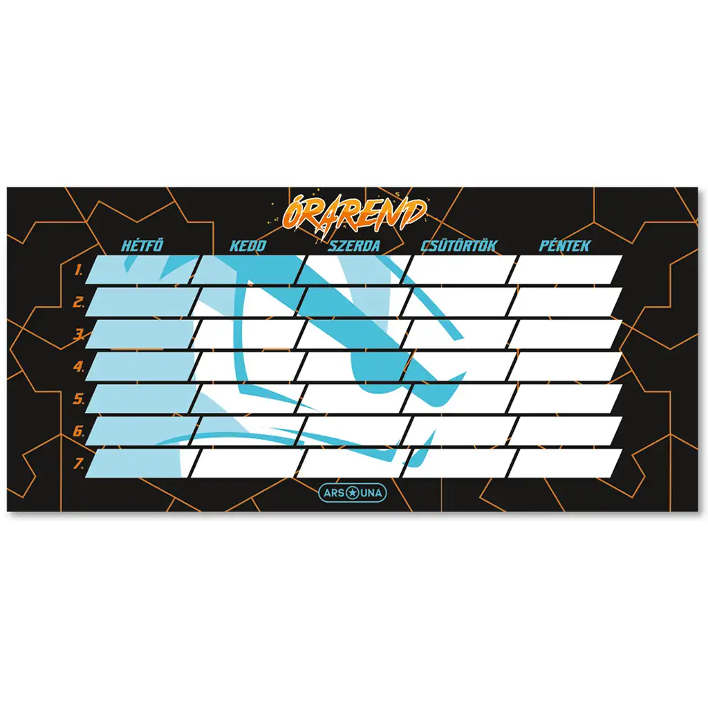 Descoperă orarul Ars Una Player One, un accesoriu dinamic și stilat pentru fiecare elev gamer. Acest orar este decorat cu un model de linii portocalii pe un fundal negru, oferind nu doar practicitate, ci și un aspect modern și cool care îți va înveseli fiecare zi.