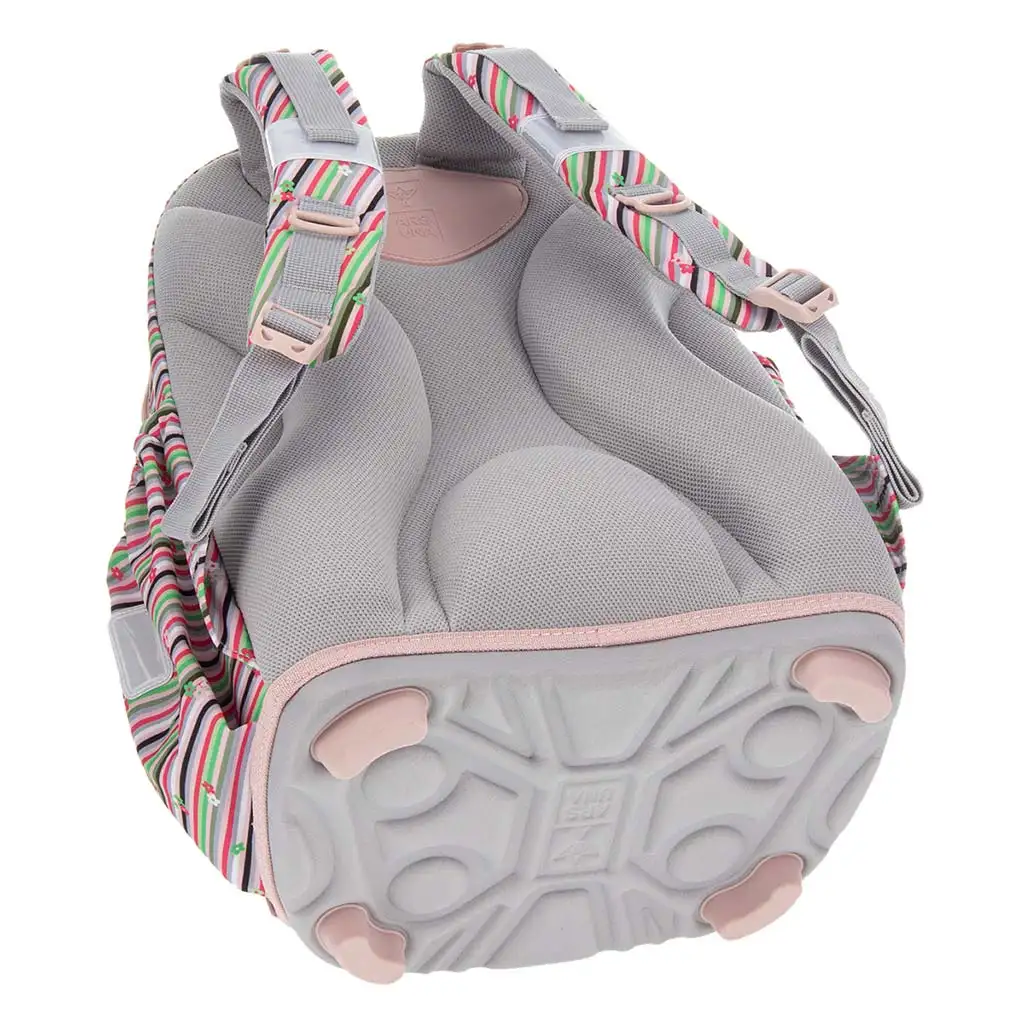 Ghiozdanul nu este doar frumos, ci și extrem de confortabil și funcțional. Designul său prietenos cu coloana vertebrală, spatele gros și buretat, precum și partea lombară căptușită asigură confort pe tot parcursul zilei. Bretelele moi pentru umeri sunt reglabile în mai multe puncte, adaptându-se perfect la constituția copilului. Partea inferioară rezistentă este protejată de patru piciorușe din plastic, astfel încât fundul ghiozdanului nu se deteriorează ușor nici când este așezat pe jos. Trei compartimente spațioase asigură o organizare eficientă pentru toate rechizitele, în cel mai mare existând un separator textil, iar în cel mai mic un suport pentru instrumente de scris și un buzunar pentru legitimații. Cele două buzunare laterale cu elastic sunt ideale pentru sticluță sau alte obiecte mici, iar elementele reflectorizante sporesc siguranța copiilor în trafic.