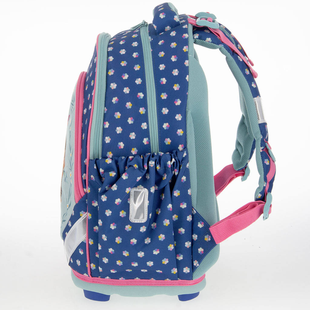Geanta cu design practic are 3 compartimente mari cu fermoar, astfel încât toate rechizitele să încapă comod. În compartimentul cel mai mare, un separator textil ajută la organizarea cărților și caietelor, iar în compartimentul cel mai mic există suporturi separate pentru instrumente de scris și pentru legitimație. Cele două buzunare laterale elastice sunt ideale pentru sticlă de apă sau pentru accesorii mai mici.