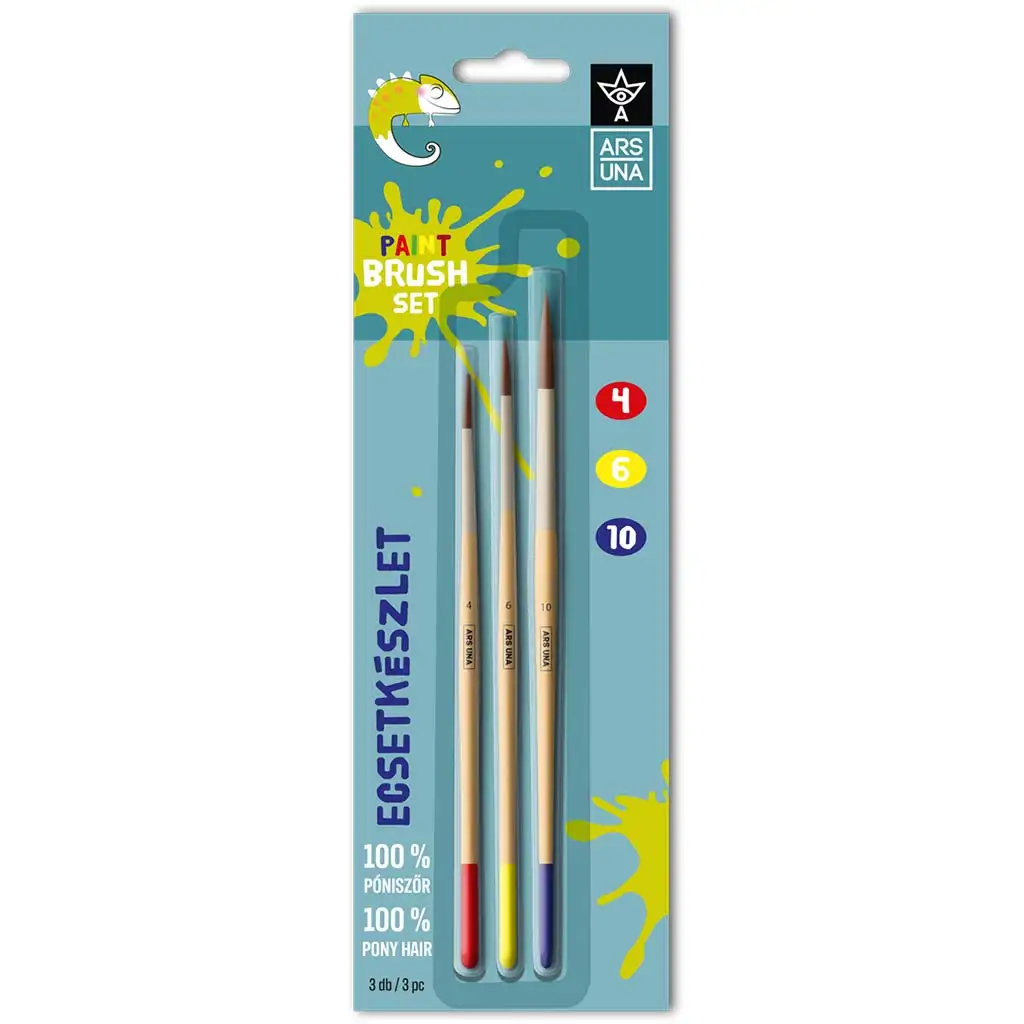 Acest set de pensule ARS UNA de 3 bucăți este alegerea perfectă pentru micii artiști care adoră să se cufunde în lumea picturii. Setul conține trei pensule de dimensiuni diferite (4, 6 și 10), astfel încât poți realiza cu ușurință diferite detalii și grosimi de linii. Pensulele sunt fabricate 100% din păr de ponei, oferind o soluție mai durabilă și mai flexibilă decât periile sintetice. Acest lucru asigură că fiecare trăsătură este uniformă și precisă. Capul pensulei din păr de ponei, cu un design fin și ascuțit, permite realizarea celor mai fine detalii, în timp ce părțile mai groase pot acoperi suprafețe mai mari. Mânerul din lemn al pensulelor oferă o prindere confortabilă, astfel încât copiii să-și poată controla cu ușurință mișcările. Acest set este un cadou ideal pentru orice mic artist care dorește să-și dezvolte abilitățile creative.