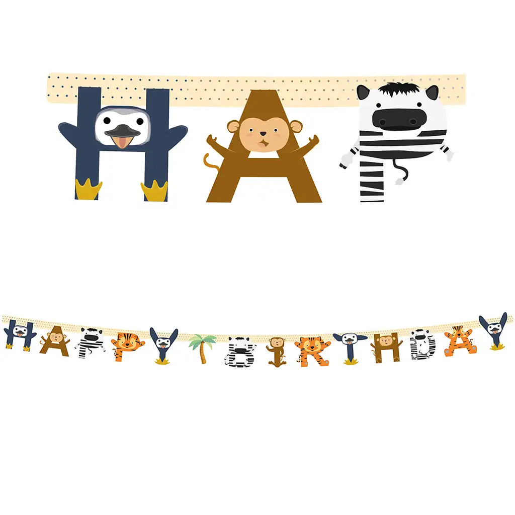 Acest banner vesel și colorat cu animale pentru ziua de naștere este alegerea perfectă dacă dorești o decorațiune de aniversare cu tematică animalieră și atmosferă veselă! Literele inscripției "Happy Birthday" sunt decorate cu animale drăguțe din junglă și savană – inclusiv pinguin, maimuță, zebră, tigru și multe alte personaje prietenoase pe care copiii le vor adora cu siguranță.