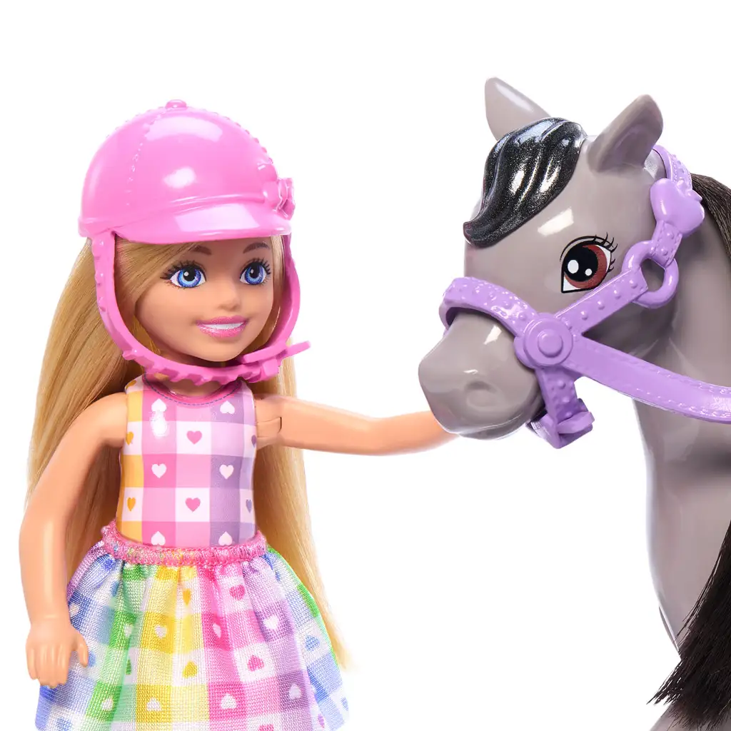 La galop! Setul de joacă Barbie: Chelsea și poneiul îi face fericiți pe toți copiii care iubesc caii și jocurile pline de aventuri. În set, Chelsea, adorabila surioară mai mică a lui Barbie, stă în șa roz, veselă, pe spatele poneiului, gata pentru noi descoperiri. O particularitate a păpușii este că genunchii îi sunt flexibili, astfel încât poate „călări” cu adevărat când este așezată pe ponei – iar picioarele ei se potrivesc perfect în scară, făcând jocul și mai realist.