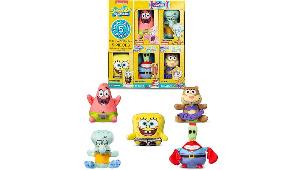 În colecția de plușuri Micro Teenies SpongeBob se găsesc SpongeBob, Patrick, Domnul Krabs, Sandy și Squidward. Aceste plușuri drăguțe și detaliate sunt perfecte pentru orice fan care dorește să își ia personajele preferate oriunde cu el. Fiecare membru al seriei are un aspect unic și o execuție adorabilă, minuțioasă, astfel încât sunt o alegere excelentă atât pentru colecționari, cât și pentru copii.Aceste plușuri au dimensiunea perfectă pentru a le lua cu tine în călătorii, deoarece încap cu ușurință într-un rucsac sau altă geantă, fără să ocupe prea mult spațiu. În plus, sunt super moi, astfel încât copiii le pot folosi confortabil în timpul drumurilor lungi cu mașina, în avion sau în orice altă aventură unde spațiul este limitat. Pachetul conține toate cele cinci personaje, astfel încât copiii își vor găsi cu siguranță preferatul dintre ele. Aceste plușuri nu sunt doar practice și confortabile, ci aduc și bucurie celor mici, fie că sunt acasă, fie pe drum.