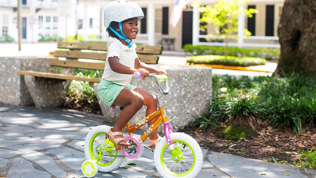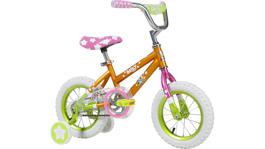Această bicicletă de 12 inci are o combinație de culori vii de roz, verde și portocaliu, precum și grafice inspirate de Bluey. Copiii pot învăța să meargă pe bicicletă cu ajutorul roților ajutătoare detașabile și al frânei de picior ușor de utilizat. Această bicicletă este o alegere ideală pentru copiii mici care încep să descopere bucuriile ciclismului. Designul colorat și modelele drăguțe fac învățarea și mai atractivă, în timp ce sistemul de frânare sigur și roțile ajutătoare care oferă stabilitate asigură liniștea părinților.
