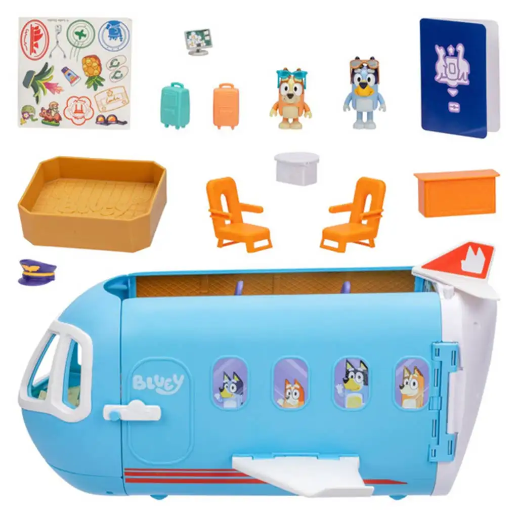 Când vine timpul pentru vacanță, avionul se poate transforma într-o stațiune de plajă veselă, unde personajele pot face plajă, savura cocktailuri și se pot relaxa. Dar dacă dorești aventuri, avionul se poate transforma într-o barcă, cu care Bluey și prietenii săi pot explora marea. Setul este pliabil și extensibil, ajungând până la 70 cm lățime, oferind mult spațiu pentru joacă.