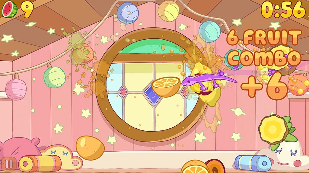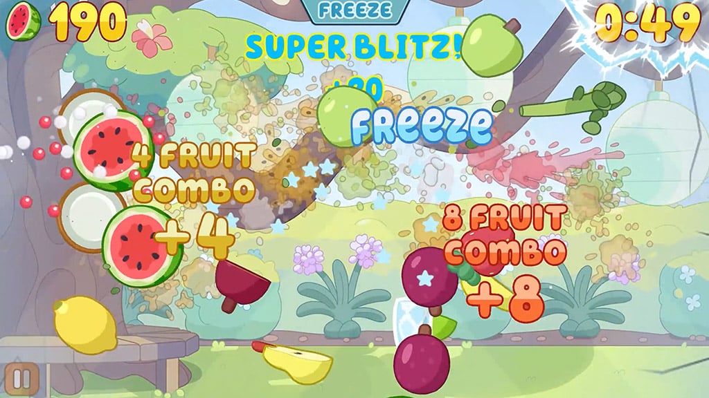 Crossover-ul extinde jocul cu patru noi evenimente cu fructe, în care personajele populare din îndrăgita serie pentru preșcolari joacă rolul principal. Copiii pot pregăti, ca niște adevărați maeștri bucătari, o salată de fructe fin tăiată, evitând cu îndemânare sparanghelul. Îl pot ajuta pe Bluey să-l prindă pe Gecky, care cade de pe tavan. Bingo și bagheta sa magică promit și ele aventuri palpitante, iar felierea rapidă a fructelor aduce și mai multă veselie. Fiecare aventură este în același timp distractivă și delicioasă, astfel încât copiii vor savura garantat fiecare moment al jocului!