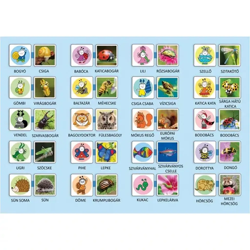Dezvoltare și distracție merg mână în mână – descoperă lumea lui Bogyó și Babóca cu acest joc vesel de memorie! Jocul de memorie „Cine e cine?” nu este doar o activitate minunată pentru cei mici, ci îi ajută și să își dezvolte abilitățile de observație, concentrarea și memoria. Personajele drăguțe – Bogyó, Babóca, Baltazár, Pihe și ceilalți – formează acum perechi cu animale adevărate, astfel că joaca devine și o oportunitate de învățare: cui îi aparține buburuza, albina, melcul sau bufnița?