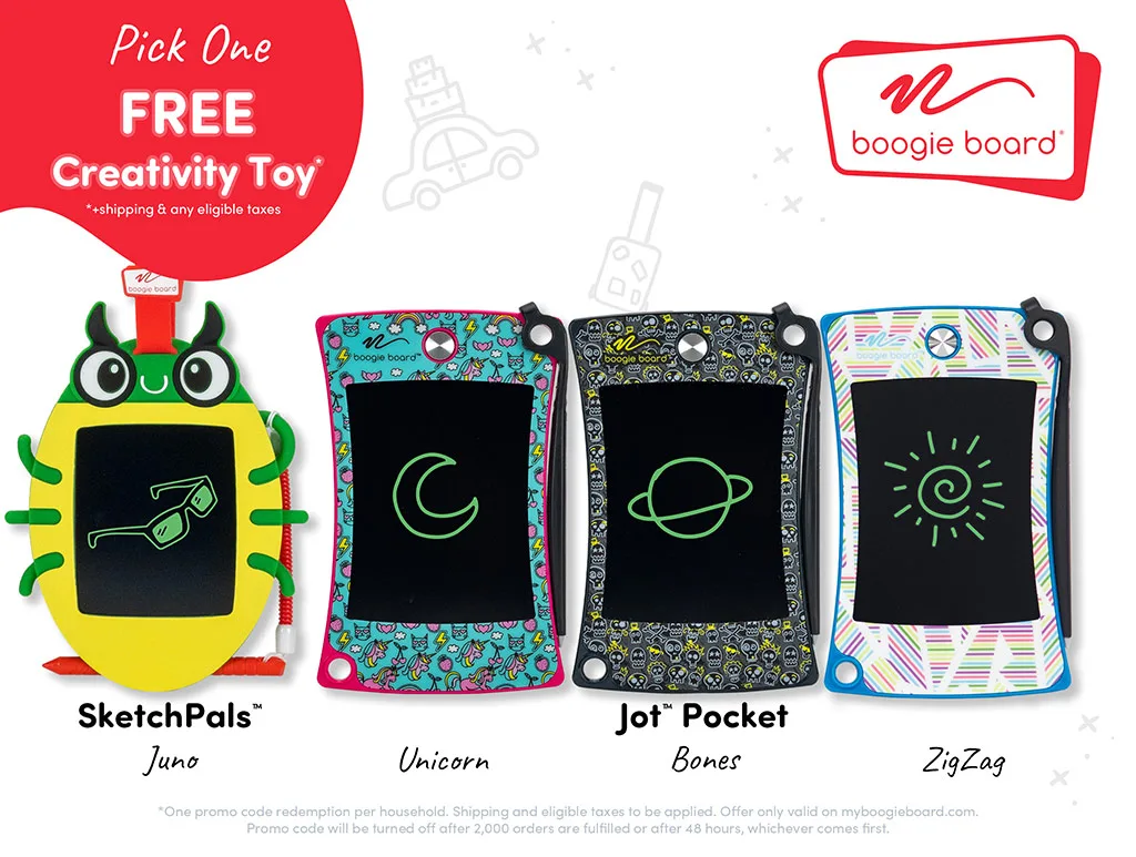 Familiile pot alege între Sketch Pals Doodle Board sau tableta Jot Pocket, o mini tablă de scris ideală pentru bagajul de mână, disponibilă în trei modele distractive: Unicorn, Bones sau Zigzag.*Oferta este valabilă doar pe piața americană, timp de 48 de ore sau până când primele 2,000 de produse sunt revendicate