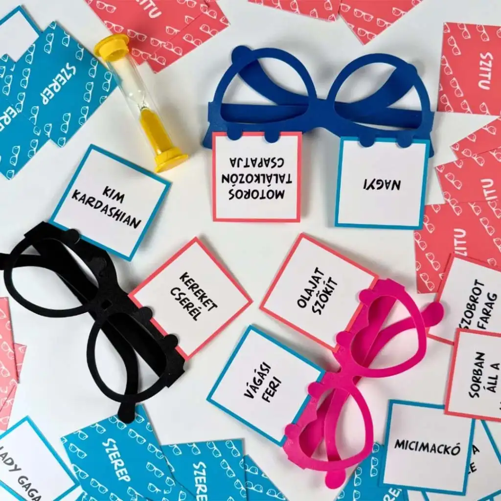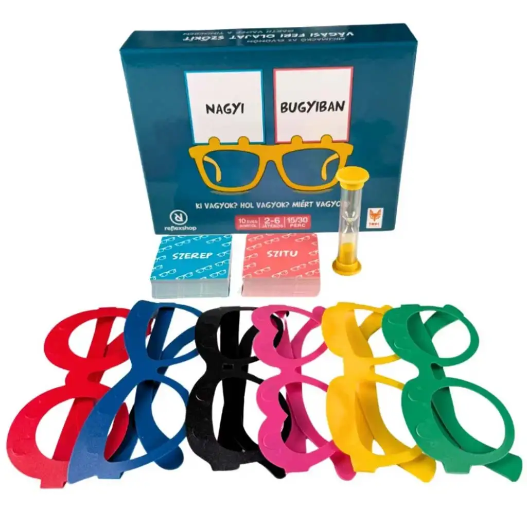 - Cutia conține: 50 cartonașe cu roluri, 50 cartonașe cu situații, 24 cartonașe goale, 6 perechi de ochelari, 1 clepsidră, 1 regulament