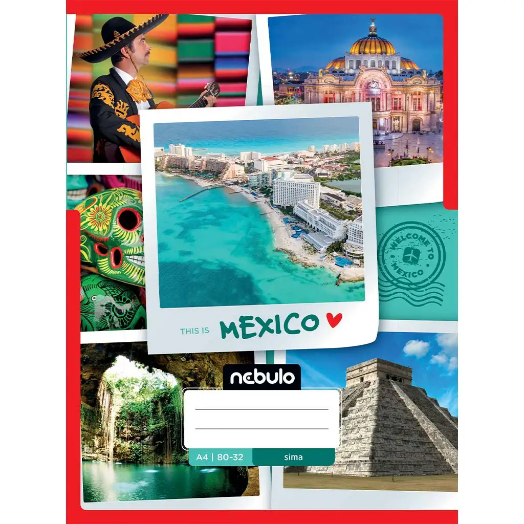 Dacă copilul tău iubește să descopere lumea și este interesat de alte culturi, atunci acest caiet cusut, simplu, cu model inspirat din Mexic (80-32 A/4) va fi alegerea perfectă pentru el. Pe copertă prinde viață lumea fascinantă și colorată a Mexicului: stațiuni de pe litoral, celebra piramidă Chichén Itzá, imagini vibrante ale orașelor, motive populare tradiționale și figuri iconice ale culturii bogate. Această atmosferă vizuală poate fi atât inspiratoare, cât și instructivă – în timp ce copilul folosește paginile caietului, coperta îl invită într-o călătorie imaginară.