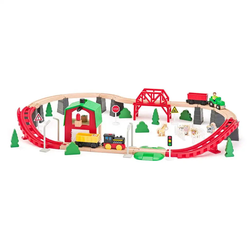 Setul din lemn de 60 de piese cu cale ferată cu tematică agricolă, locomotivă și alte accesorii aduce o adevărată aventură în camera copilului. Pista detaliată cu tematică de fermă, cu poduri, pante și curbe, face jocul și mai palpitant. Pe lângă locomotivă și vagon, setul include un tractor, figuri de animale, copaci, indicatoare rutiere și o clădire de fermă primitoare, astfel încât copilul tău își poate crea iar și iar propriile povești din mediul rural.