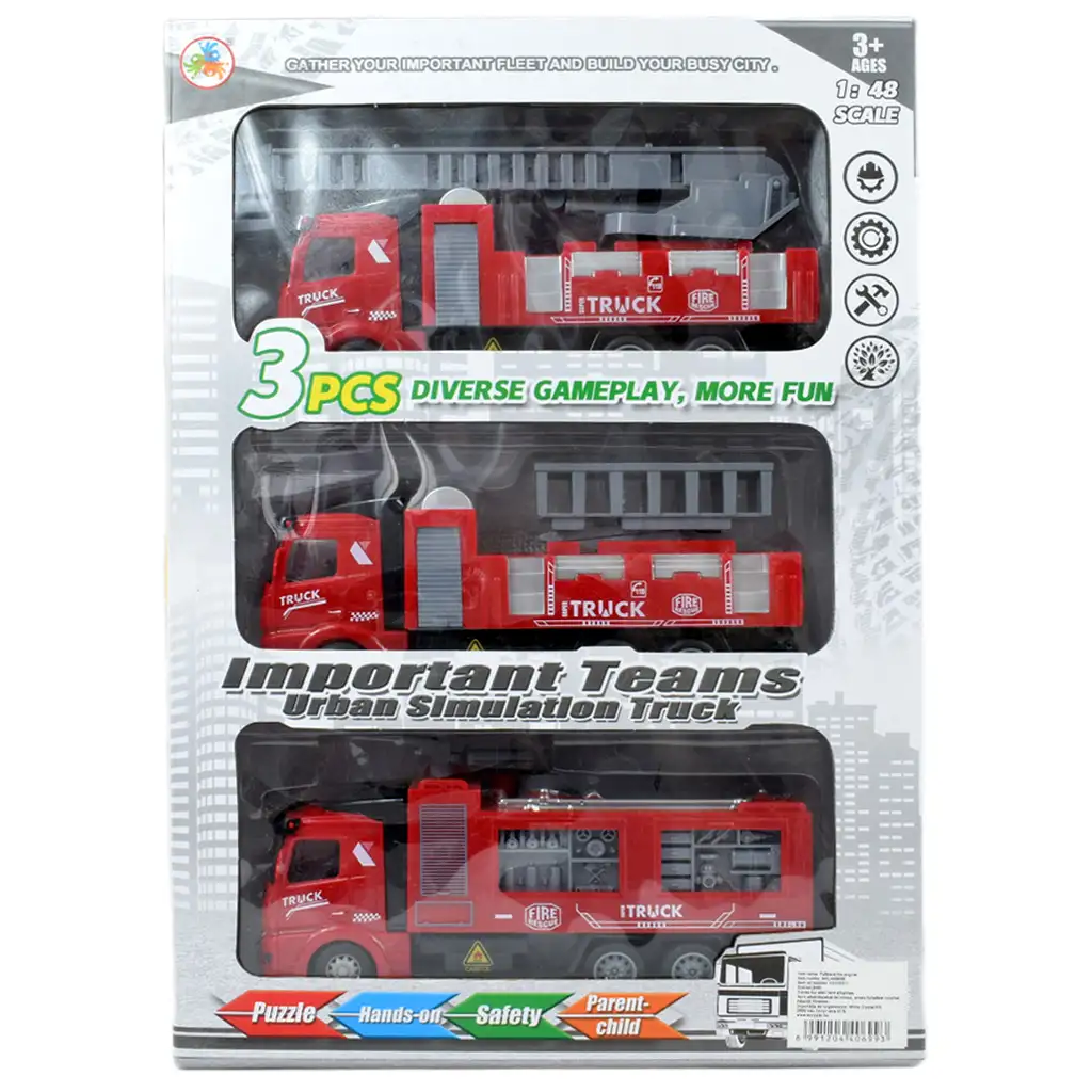 Setul include trei mașini de pompieri, astfel încât copiii pot alege cu care să se joace sau pot să le pună în mișcare pe toate odată. Acest set de jocuri este o modalitate ideală pentru copii să înțeleagă mai bine rolul important al pompierilor, în timp ce se bucură de joc și își dezvoltă creativitatea. Dimensiunea mașinilor de pompieri este de aproximativ 20 cm, ceea ce este potrivit pentru ca copiii să le poată manipula cu ușurință și să se distreze cu ele.