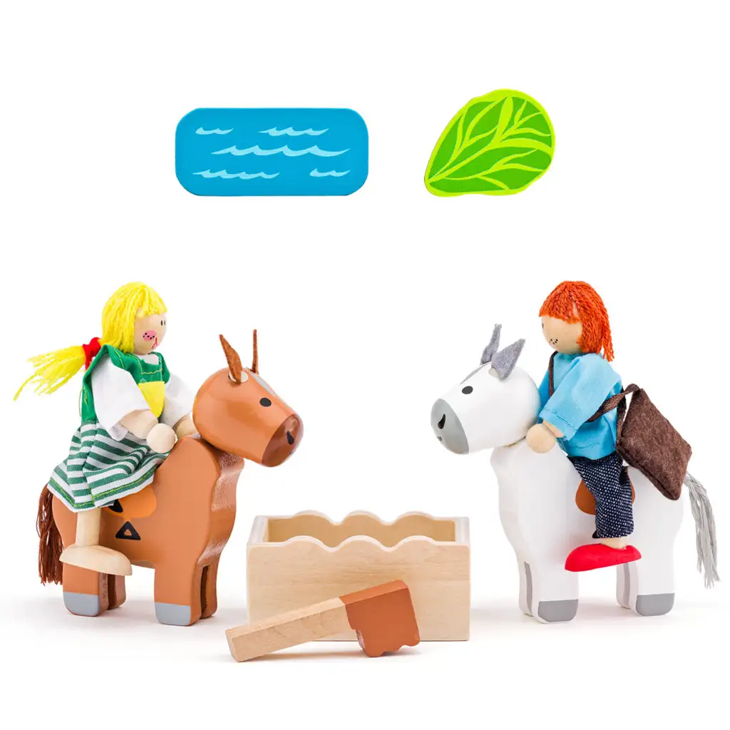 Produsul include 2 cai de lemn și 2 păpuși, ale căror picioare și brațe sunt făcute din sârmă, astfel încât pot fi modelate. Acest lucru le permite copiilor să așeze păpușile pe cai sau în cabina de transport și să le poziționeze în diferite poziții, cum ar fi stând în genunchi, culcat sau cu brațele deschise.