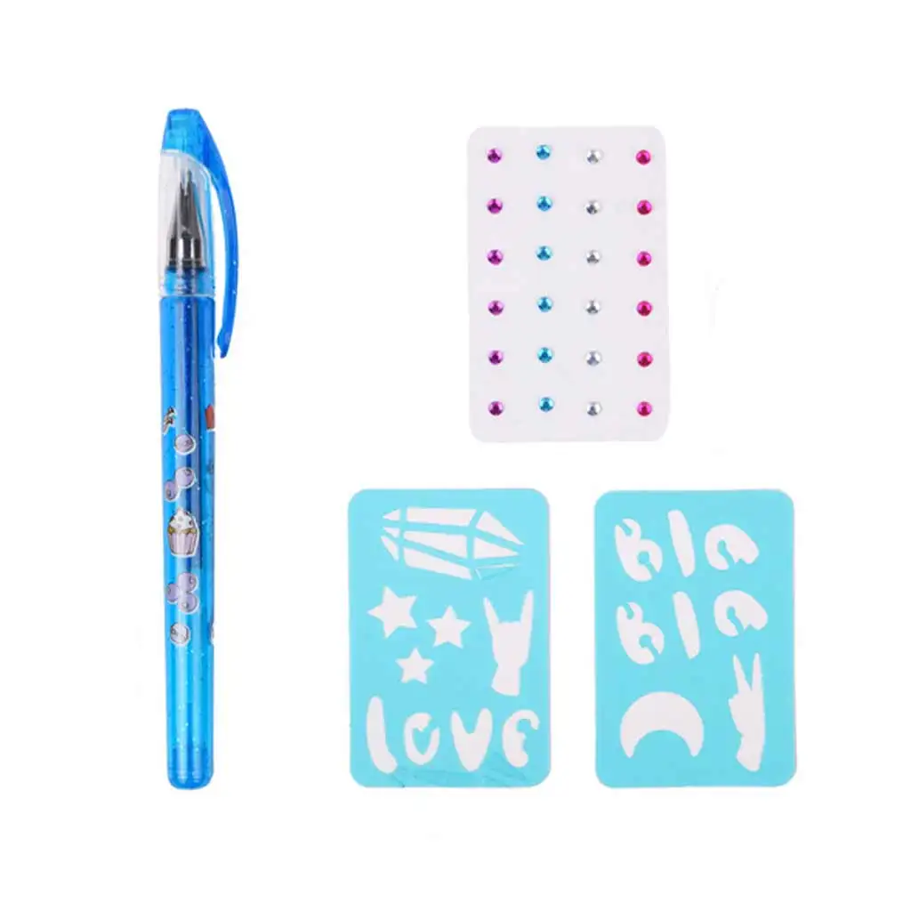 Descoperă acest stilou cu gel special, care îți va ocupa timpul liber pentru mult timp, deoarece poți tatua orice dorești cu el, totul depinde de creativitatea ta. În set, pe lângă stilou, vei găsi și pietre stras și diverse autocolante, toate acestea făcând jocul mai interesant și mai palpitant. Aceste stilouri cu gel sunt de calitate excelentă și poți fi sigur că tatuajul va rezista mult timp, însă, dacă ceva nu a ieșit bine, îl poți șterge ușor. După ce te-ai antrenat, îți poți invita prietenii și poți desena un tatuaj special pe mâna sau chiar pe piciorul fiecăruia.