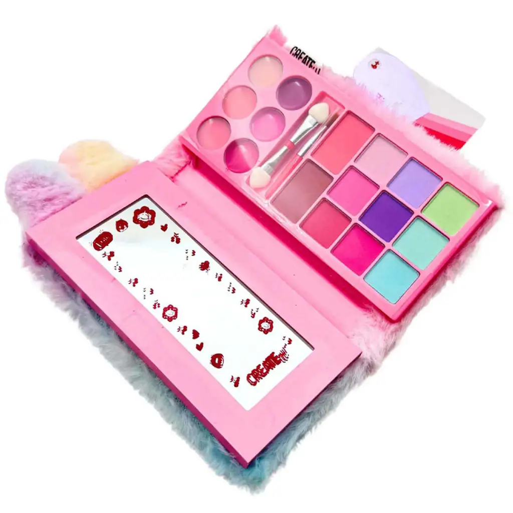 Setul de machiaj pufos Canenco: Create It! este un cadou de vis dacă copilul tău adoră jucăriile strălucitoare și creative. Husa specială, cu textură moale și în nuanțe pastel te încântă de una singură, deoarece o acoperire pufoasă decorată cu un model drăguț cu gene ascunde comorile de machiaj. La deschidere, o paletă colorată de farduri de pleoape, gloss-uri pentru buze și aplicatoare practice așteaptă ca copilul tău să încerce primele machiaje.